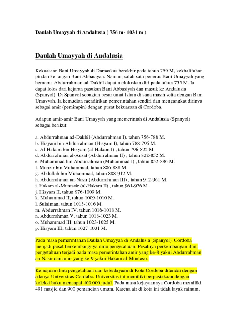 Namun salah satu penerus bani umayyah yang bernama abdurrahman ad dakhil dapat meloloskan diri pada tahun 755 m. Kerajaan kerajaan kecil yang muncul di andalusia terbentuk apabila kepimpinan utama mulai melemah. Karena alasan inilah andalusia yang diperintah oleh satu kerajaan terpecah menjadi banyak. Pada waktu bani umayyah 661 750 m yang berpusat di damaskus jatuh pada tahun 132 h 750 m dan digantikan oleh bani abbasiyah yang berkedudukan di baghdad.