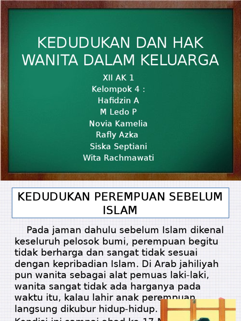 Aku tinggalkan pada kalian dua perkara di mana kalian tidak akan tersesat selama berpegang dengan keduanya yaitu kitab allah dan sunnahku diriwayatkan oleh imam malik. Tidak ada alasan apa pun yang menghalangi adanya distribusi beban sosial antara laki laki dan perempuan untuk kemaslahatan publik bagi keluarga dan masyarakat. Dalam keadaan ini adakah wanita islam harus bersikap daif. Kedudukan wanita dalam islam.