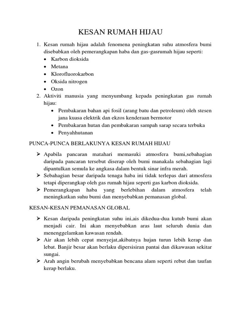 Kesan kesan pemanasan global peningkatan aras laut. Pencairan ais di kutub. Fenomena ini berlaku disebabkan oleh kesan rumah hijau yang terjadi akibat peningkatan tahap karbon dioksida dan bahan pencemar lain yang dikenali sebagai gas rumah hijau. Kesan kesan pemanasan global masalah kesihatan gelombang haba. Memusnahkan harta benda dan mengancam nyawa.