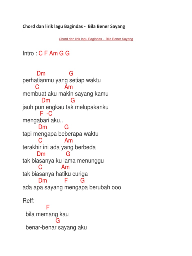 Chord Dan Lirik Lagu Bagindas Bila Bener Sayang