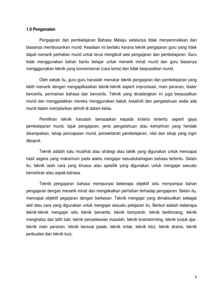 Kaedah adalah cara mengelola dan menggunakan teknik teknik pengajaran isi kandungan dan bahan bantuan mengajar oleh guru supaya objektif sesuatu pelajaran itu tercapai. Mangantar simanjuntak 1981. 16 5 0 teknik pengajaran kemahiran bahasa melayu teknik adalah satu muslihat atau strategi atau taktik yang digunakan untuk mencapai hasil segera yang maksimum pada waktu mengajar sesuatu bahagian bahasa tertentu. Untuk meninjau penglibatan murid orang asli dalam setiap aktiviti pengajaran dan pembelajaran bahasa melayu yang mengaplikasikan teknik drama.
